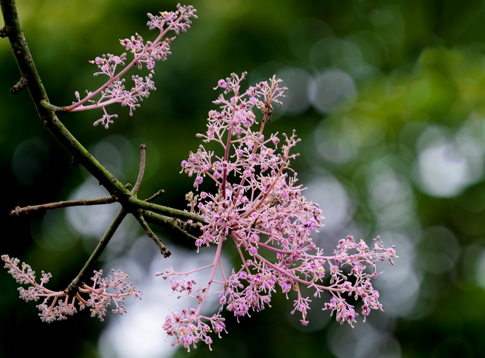Không rực rỡ như phượng đỏ hay nồng nàn như bằng lăng tím, hoa ngô đồng mang một vẻ đẹp lặng lẽ, thanh cao. Những chùm hoa nhỏ li ti kết lại thành từng cụm dày, phủ kín các cành cây trơ lá, tạo nên gam màu tím nhạt dịu dàng, đôi khi ngả sang sắc hoa cà. Chính sự giản dị ấy lại khiến loài hoa này trở nên đặc biệt, đủ sức níu chân bất cứ ai một lần bắt gặp.
